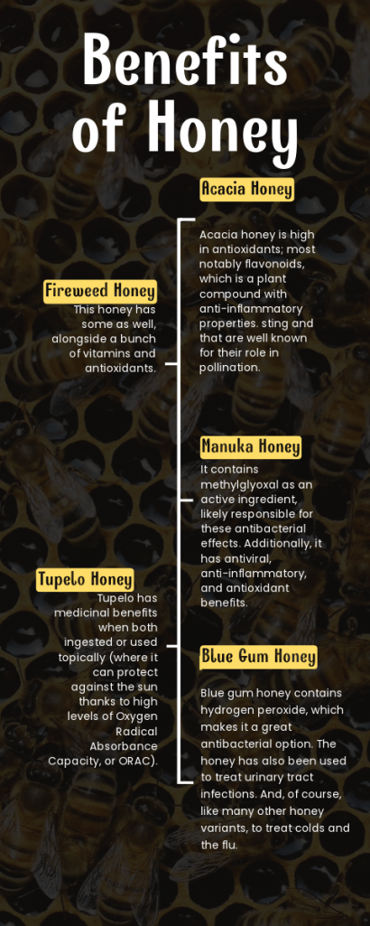 Honey continues to be a favored sweetener and/or remedy for us. With over 26 varieties, a person should recognize the plants, flowers, and processes for each one, and how it adds taste and/or health benefits to us.