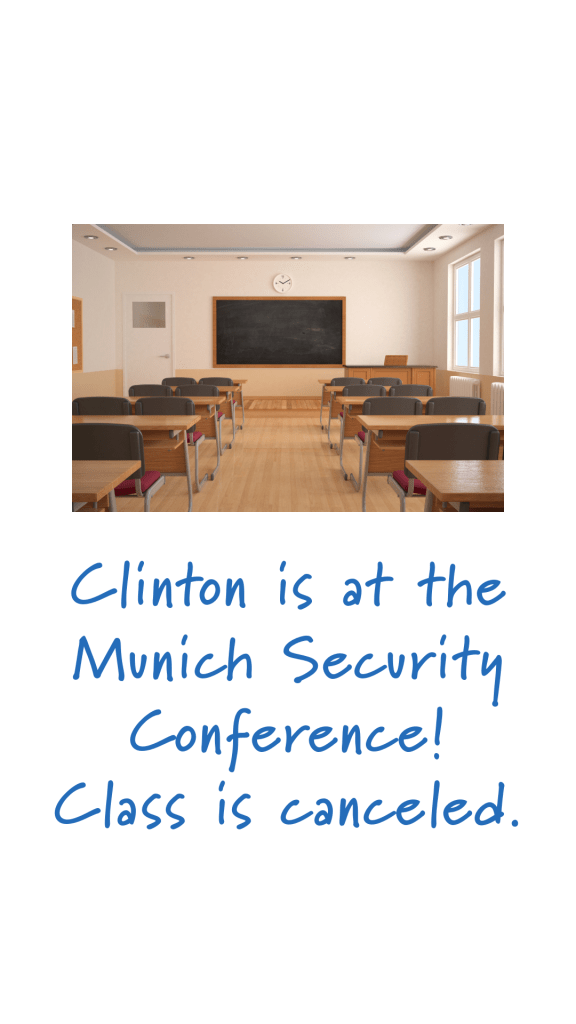 Today, February 18, Clinton attended the Munich Security Conference in Germany. A few keynote speakers and attendees of the event were Alexander Stubb who served as the Prime Minister of Finland and Salome Zourabichvili, the current President of Georgia.